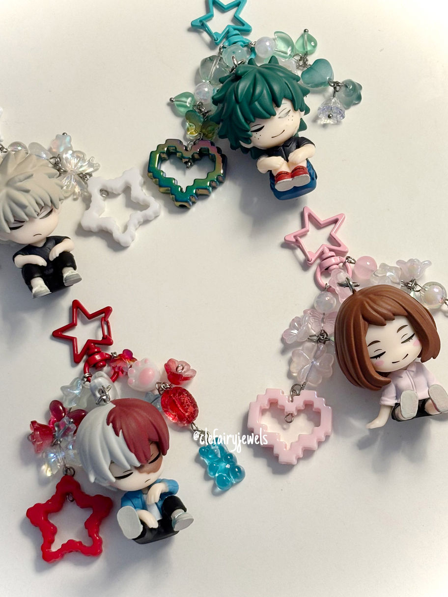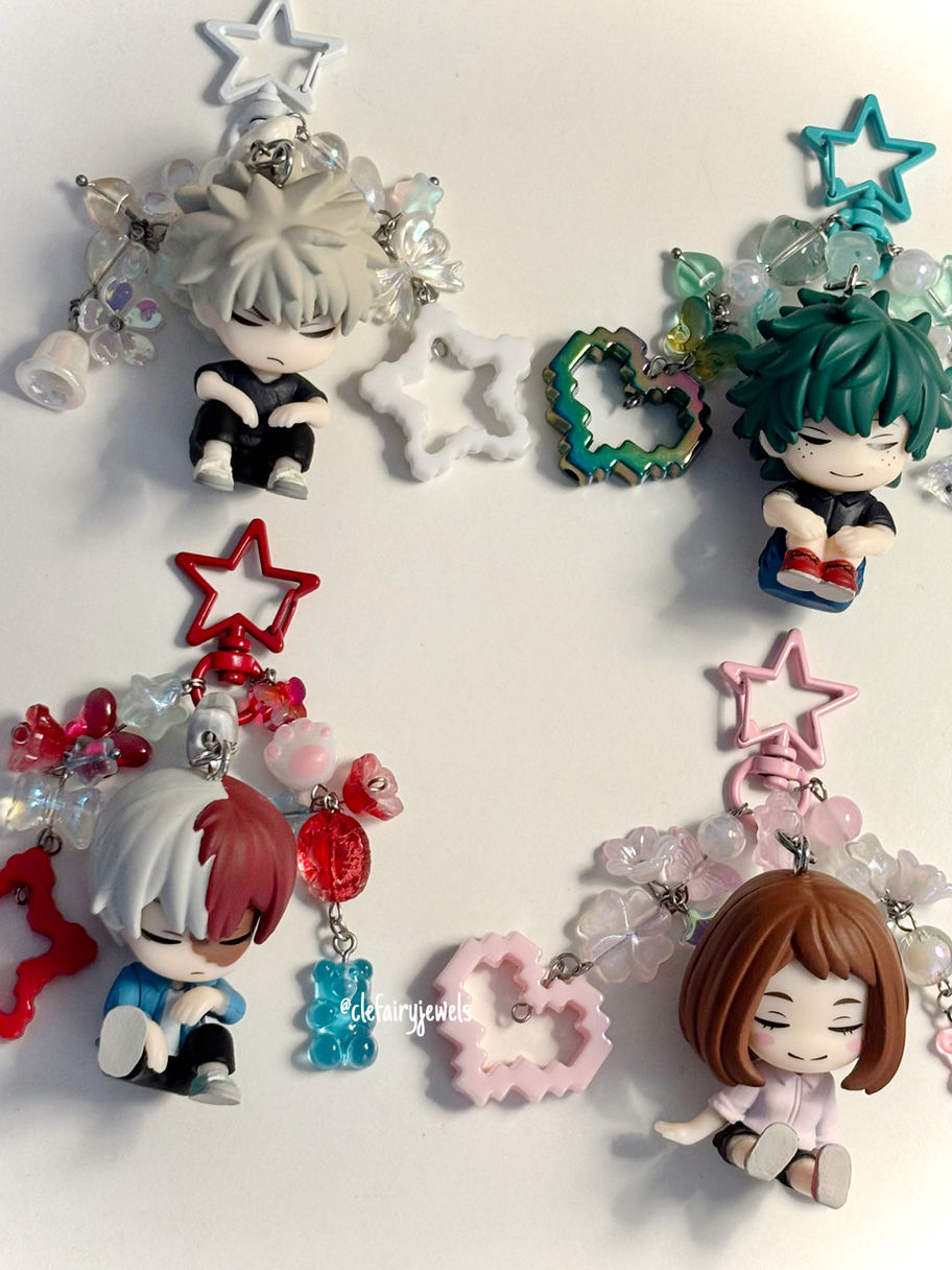 Handmade beaded bag charms attached to My Hero Academia Figures
