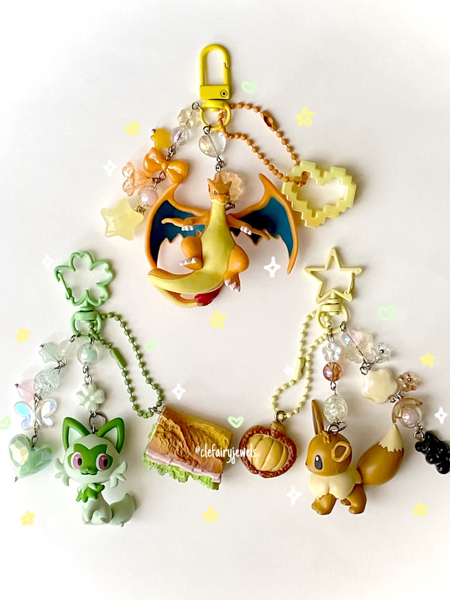 Handmade beaded bag charms attached to Pokemon Gashapon figures