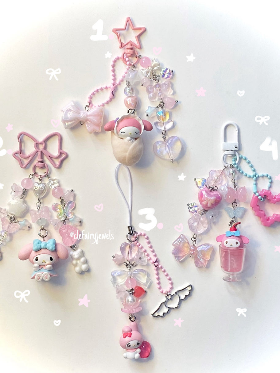 Handmade beaded bag charms & phone charm attached to authentic Sanrio gachapon and Kirby Sweet Dreams Figures